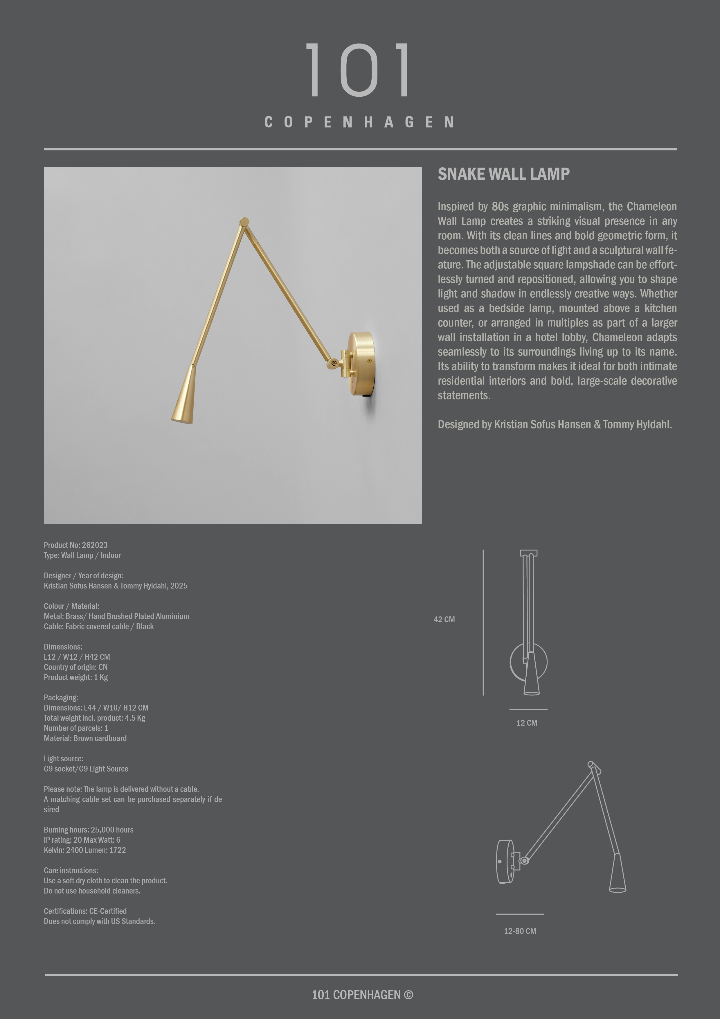 Snake è uno studio sul movimento e sulla luce, dove il metallo è plasmato in una linea fluida, quasi viva, nello spazio. Ispirati dal movimento silenzioso ed elegante del serpente, i tubi sottili si snodano con precisione scultorea e guidano l'occhio verso i paralumi conici, che emettono una luce calda e piacevole. La forma appare in costante movimento, anche quando la lampada è ferma, creando un raffinato gioco tra il freddo metallo e il morbido bagliore della luce. Snake aggiunge una presenza calma ma espressiva allo spazio, dove la luce diventa parte dell'architettura e non solo una funzione.