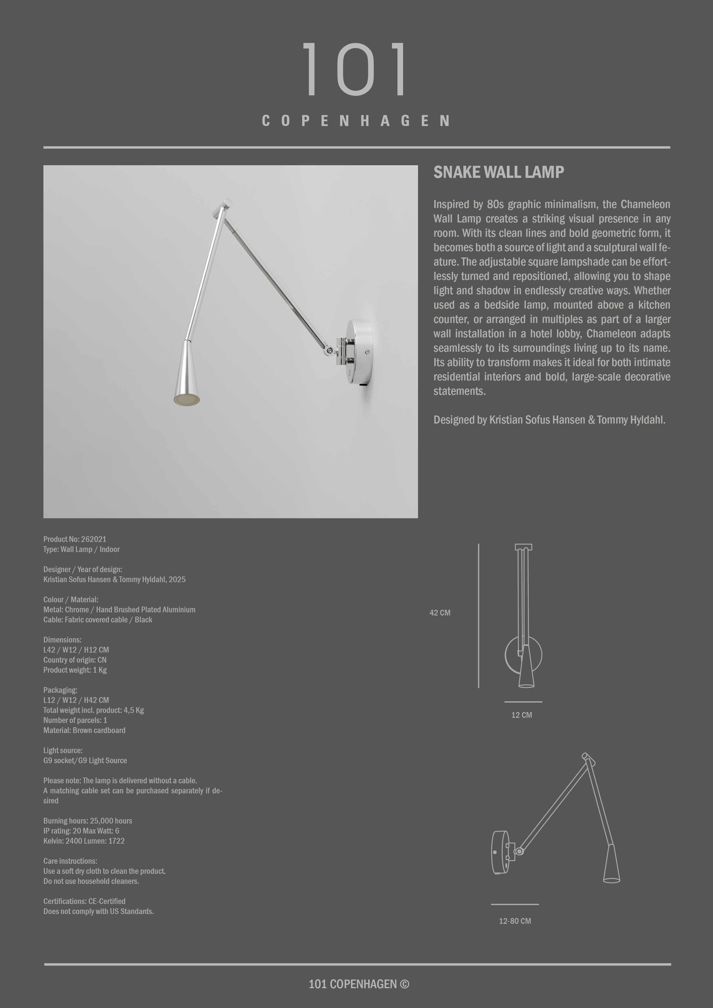 Snake è uno studio sul movimento e sulla luce, dove il metallo è plasmato in una linea fluida, quasi viva, nello spazio. Ispirati dal movimento silenzioso ed elegante del serpente, i tubi sottili si snodano con precisione scultorea e guidano l'occhio verso i paralumi conici, che emettono una luce calda e piacevole. La forma appare in costante movimento, anche quando la lampada è ferma, creando un raffinato gioco tra il freddo metallo e il morbido bagliore della luce. Snake aggiunge una presenza calma ma espressiva allo spazio, dove la luce diventa parte dell'architettura e non solo una funzione.