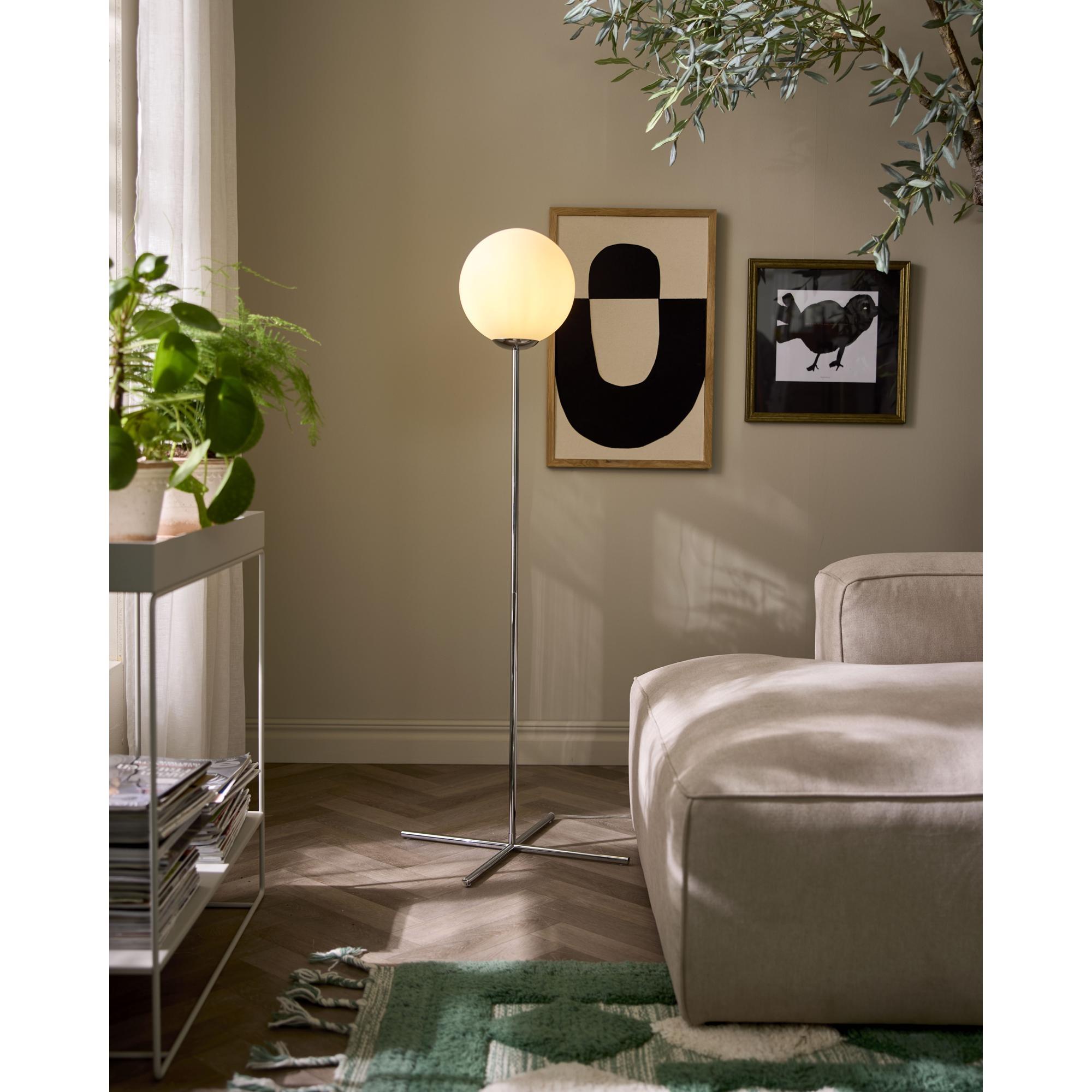 Con la sua struttura sottile e il paralume in vetro opalino, la lampada da terra Runa appare elegante e ben bilanciata. La luce si diffonde dolcemente e crea un'atmosfera piacevole, rendendo la lampada ideale come complemento all'illuminazione della stanza. La finitura cromata aggiunge leggerezza e un tocco moderno, rendendo la lampada adatta sia ai soggiorni che agli spazi più aperti, dove contribuisce discretamente all'insieme.