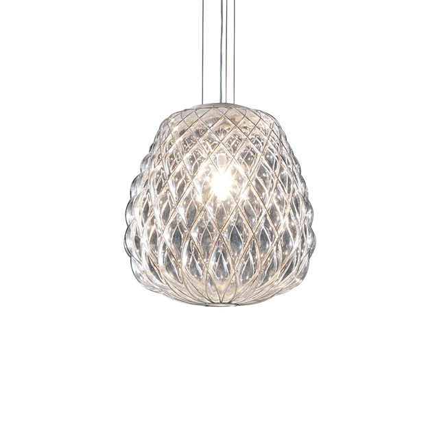 La serie Pinecone di FontanaArte è un esempio unico di artigianalità italiana e design senza tempo, dove tecnologia ed estetica si fondono in perfetto equilibrio. La lampada è realizzata in vetro soffiato a bocca, modellato direttamente all'interno di una griglia in acciaio durante la produzione: un processo che crea la caratteristica struttura e un vibrante gioco di luce e materia. La luce si diffonde morbidamente attraverso il vetro e diffonde un'atmosfera calda e accogliente, mentre la griglia metallica conferisce alla lampada un'espressione moderna e architettonica. Pinecone è sia un oggetto di illuminazione funzionale che una decorazione scultorea che aggiunge personalità e carattere all'ambiente, indipendentemente dal fatto che venga utilizzata come lampadario sopra il tavolo da pranzo o come suggestiva lampada da tavolo in soggiorno o in camera da letto. La serie rappresenta la capacità di FontanaArte di combinare la tradizione artigianale con un linguaggio di design moderno in un modo esclusivo e senza tempo.