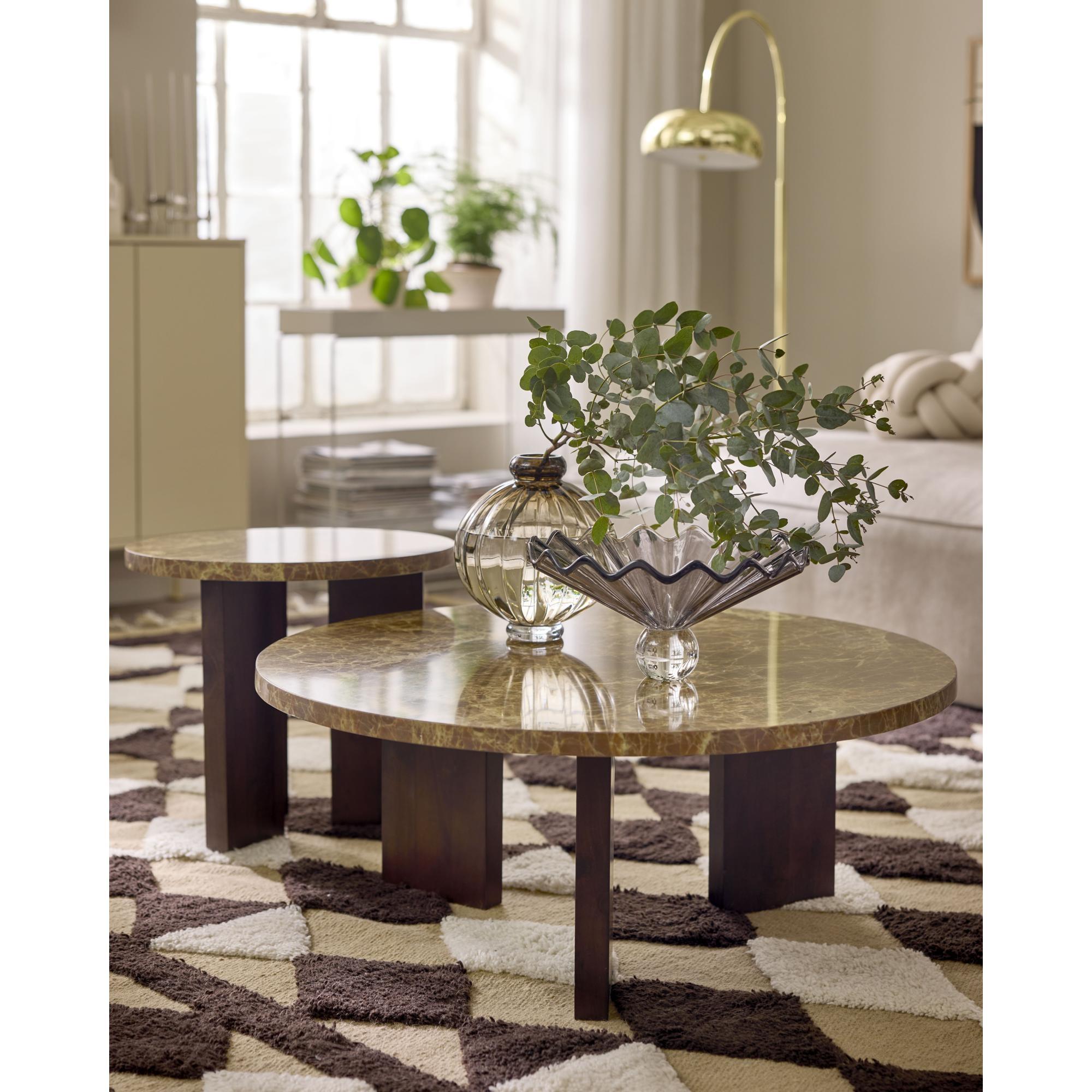 Con la sua palette di colori scuri e i materiali naturali, il tavolino Eden si distingue come elemento d'arredo elegante e suggestivo. Il piano in pietra marrone conferisce al tavolo un'espressione esclusiva e tranquilla, mentre la base in rovere scuro aggiunge calore e profondità. Il tavolo è ideale come tavolino e si adatta sia in modo pratico che decorativo al soggiorno.
